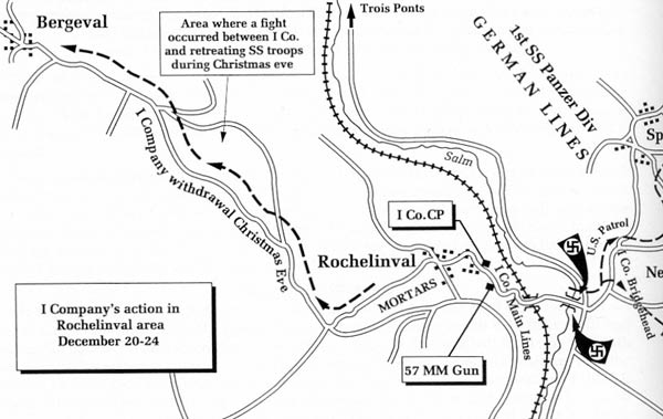 Op 21 december vielen elementen van het 1ste SS panzerregiment en de 9de SS panzerdivisie ons aan. Hevige gevechten braken los in de buurt van Trois-Ponts. Alhoewel wij licht bewapend waren, deden onze anti-tank wapens hun opdracht. Op een bepaald ogenblik, het liep tegen de avond, liep ik terug naar onze CP, (Command Post). De namiddag werd al vlug avond. Tijdens mijn tocht stopte ik om een .30 mitrailleursnest te controleren.
